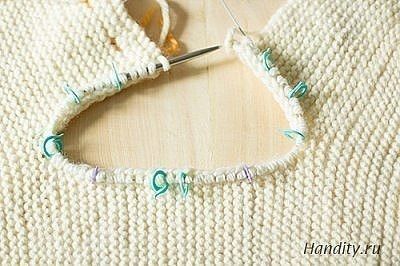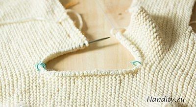 1 Наберите петли по горловине для дальнейшего вывязывания капюшона спицами.