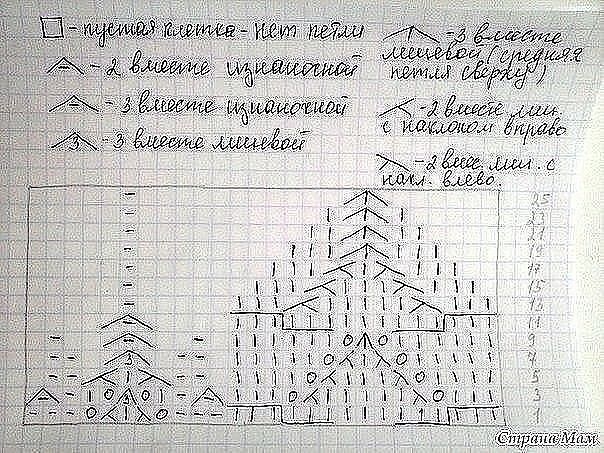 На схемах приведены только нечетные ряды, в четных рядах петли вяжем по рисунку, накиды - лицевыми (вязание круговое).