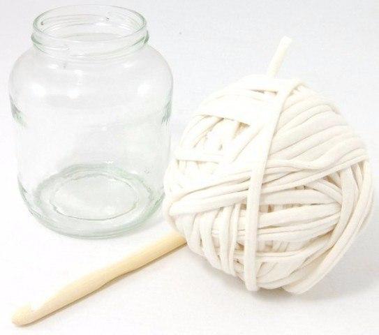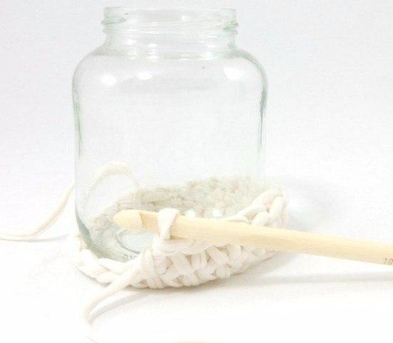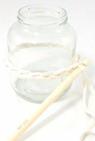 Органайзер для крючков и спиц может быть выполнен из баночки и остатков пряжи.