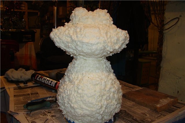 2. Скрепляем туловище и голову с помощью проволоки, шпильки, палочки…, закрепляем тут же пеной.