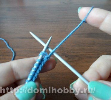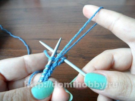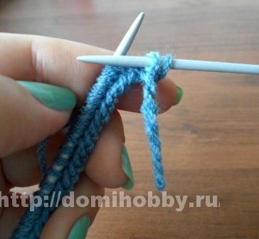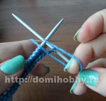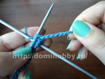 Далее длинную петлю средним пальцем правой руки согните пополам, а петельку с указательного пальца переснимите на левую спицу.