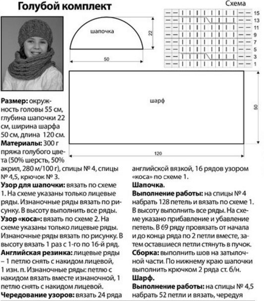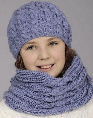 Шапка и шарф, связанные интересным узором, будут на осень из более тонкой пряжи.