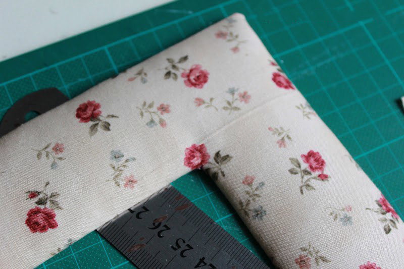5.Затем отрезаем кусок ткани по размерам рамки, оставляя отступы 2-2,5см. Укладываем ровно ткань, синтепон, картон. Следим, чтобы ничего никуда не съехало!