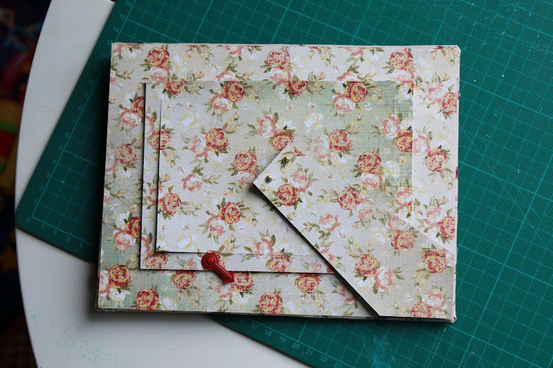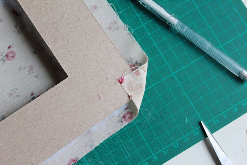 Затем приклеиваем бумагу на заднюю часть нашей рамки и разрезаем, проведя по надрезам на картоне.