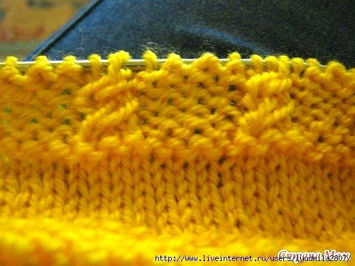 Вяжем этим рисунком до нужной длины. 4 последних ряда изн. петли. Закрыть работу изнанкой, нить перед работой. Можно еще обвязать с/бн.