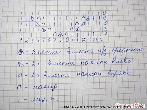 Для расширения вяжем так - накид, 3 лиц. п., накид, 4 изн. п - и так до конца ряда, след. ряд все петли по рисунку, накид провязать лиц. скрещенной, чтоб не было слишком больших дырок от накидов. Следующий ряд: накид, 5 лиц. накид, 4 изн., т. е. идет на увеличение. Прибавлять так до желаемой ширины подола. Я ориентировалась на схему рисунка с дырочками. Рисунок с дырочками (составила сама) надеюсь, понятно.