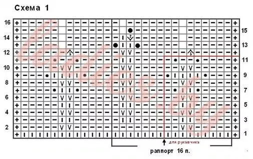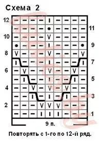 Набрать 59 п. и провязать 2 ряда платочной вязкой. Затем распределить петли следующим образом: 1 кром. + 9 первых п. схемы 1 повторить 6 раз + 3 изн. + 1 кром. = 59 п. и провязать с 1-го по 11 ряд. Затем вязать лицевой гладью, прибавив равномерно 20 п. Далее в лицевых рядах убавлять с каждой стороны по 2 п. пока не останется 49 п., которые потом закрыть.