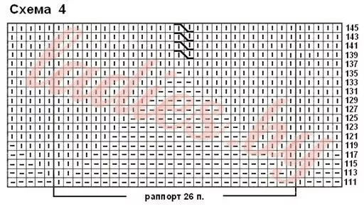 Со 111-го ряда продолжить вязание узором «треугольники», распределив петли следующим образом: 1 кром. + 21 изн. + 1 лиц. + 26 п. раппорта схемы 4 + 21 изн. + 1 кром. = 71 п.