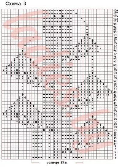 Узор «виноградная лоза»: лицевые ряды вязать по схеме 3; в изнаночных рядах петли вязать по рисунку, накиды ‒ изнаночными.