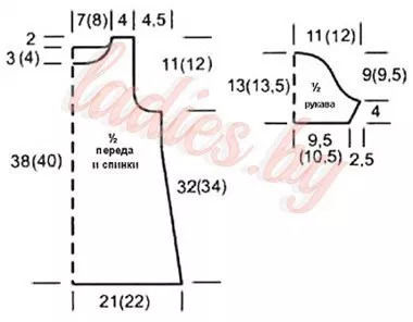 Вязать как деталь спинки, только с более глубоким вырезом горловины. Для этого в 145 ряду закрыть средние 17 п. и по обе стороны от них убавить в каждом 2-м ряду: 2 раза по 3 п., 1 раз по 2 п., 1 раз по 1 п. На высоте спинки закрыть по 18 п. каждого плеча.