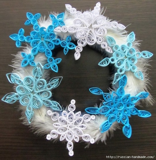 Новогодний венок со снежинками в технике квиллинг заставит вас по-другому взглянуть на новогодние венки.