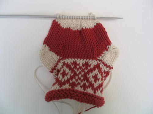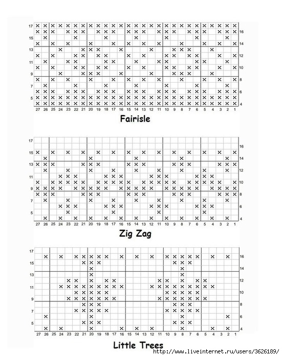 Набрать 25 п (27 п для схемы fairisle, при этом в последнем ряду схемы по изн. стороне изделия убавить 1 п с каждой стороны, что даст 25 п).