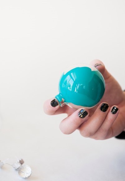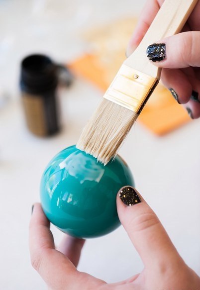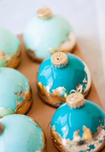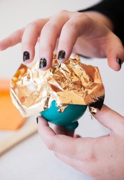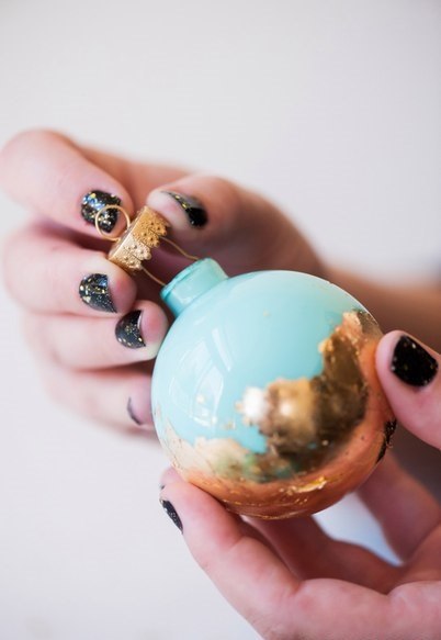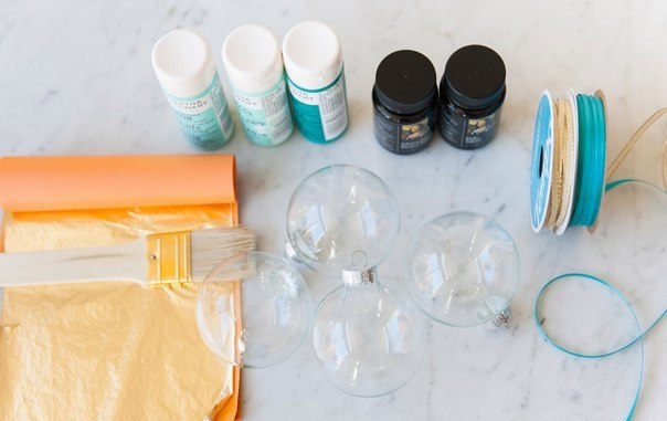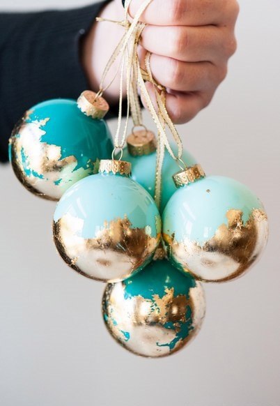 Красивые ёлочные шары с использованием краски и золотой фольги вы можете сделать сами.