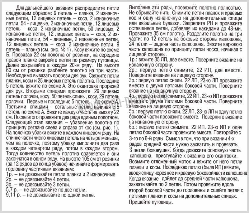 Вязание спицами пальто пончо выполняем по следующему описанию.