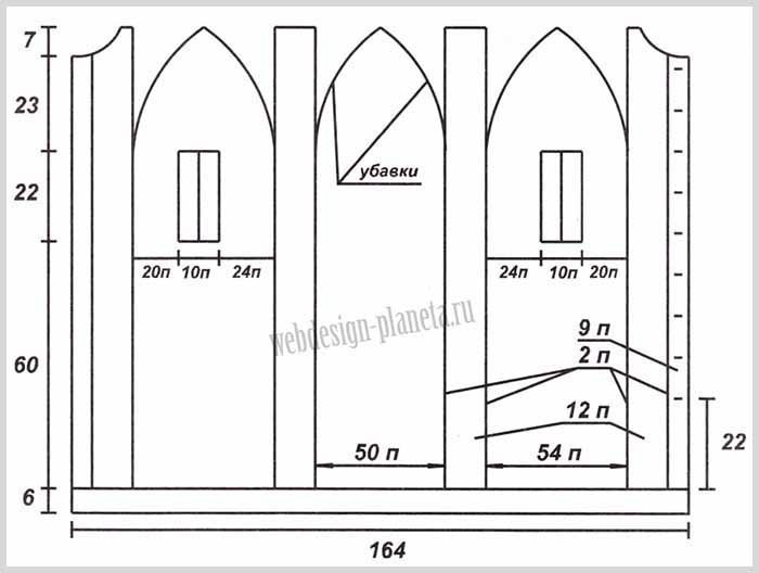 Набираем 240 пет. и 2 кромочн. Первые и последние 9 пет.- планка. Вяжем ее по схеме А. Остальные петли вяжем резинкой 2х2 на высоту 6 см.