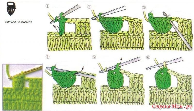 Рельефные «шишечки» образуют группы из 7-ми незаконченных столбиков с тремя накидами провязанных из одной петли, а затем провязанных вместе. Данным узором можно связать оригинальный шарф, а меланжевая пряжа еще больше подчеркивает выразительность «шишечек».