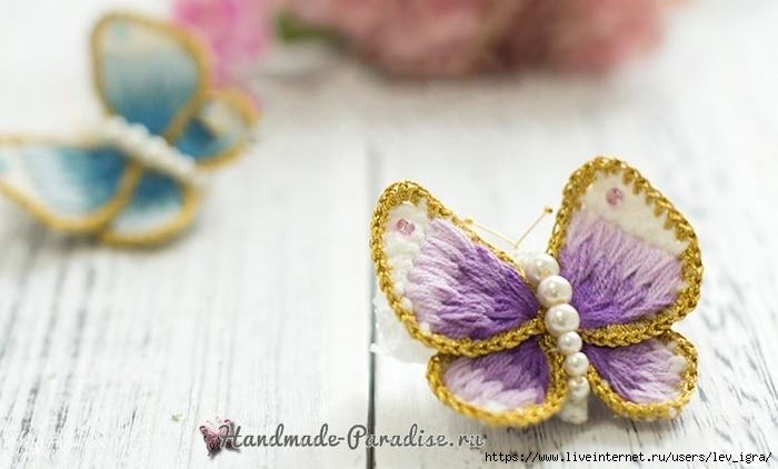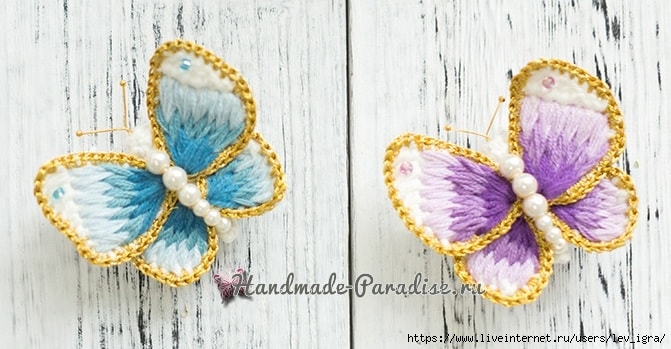 Брошь-бабочка, которая родилась из синергии вязания крючком и вышивки,