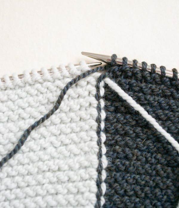Так, в лицевых рядах переход от белой нити к темно-синей (на фото) должен происходить таким образом, как показано: белую нить нужно оставить на изнаночной стороне над синей, и вязать синей нитью, как бы перекрестив ей белую.
