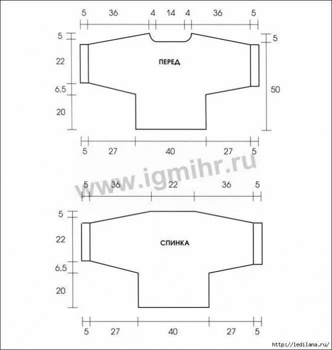 Перед. Вязать как спинку, начиная от правого рукава, но начиная с 77-го р. для выреза горловины убавлять слева в каждом 2-м р. 6 х 1 п., и начиная со 111-го р. прибавлять слева в каждом 2-м р. 6 х 1 п.