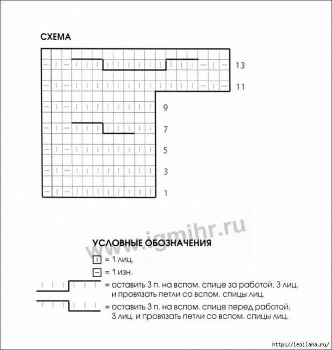 Коса налево (ширина 9 п.): 1-й, 3-й и 5-й р.: 6 лиц., 1 изн., 1 лиц., 1 изн.; 2-й и все четные р.: вязать по рисунку; 7-й р.: 6 п. перекрестить налево (оставить 3 п. на вспомогательной спице перед работой, 3 лиц. и провязать петли со вспомогательной спицы лиц.), 1 изн., 1 лиц., 1 изн.; 9-й р.: повторять раппорт с 3-го р.