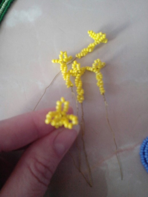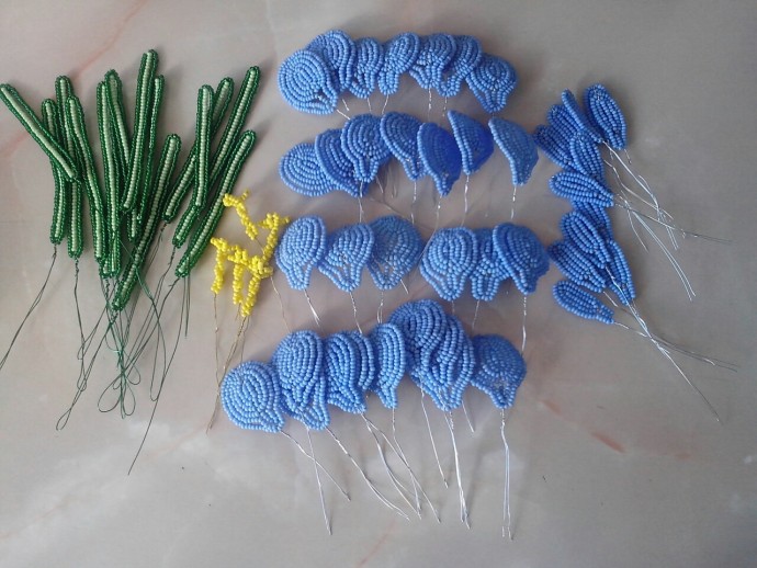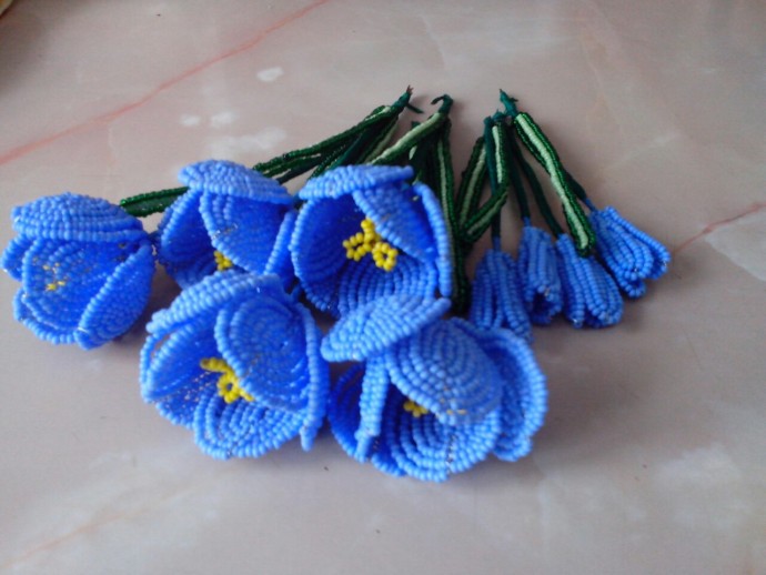 Милые цветочки из бисера: мастер-классВыполнены в необычном для цветов, но очень красивом сочетании голубого и салатового цвета.