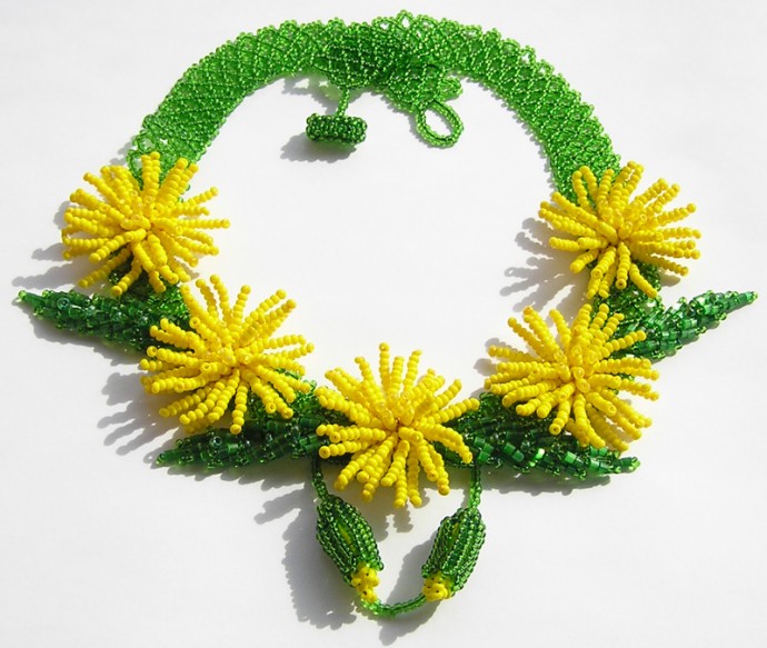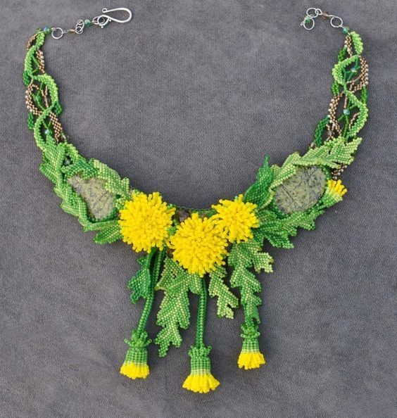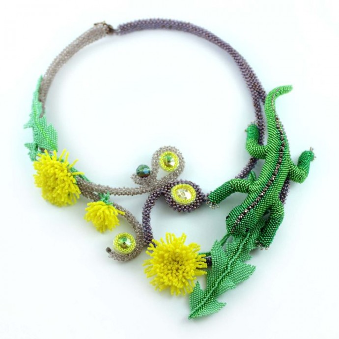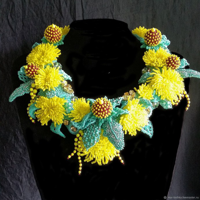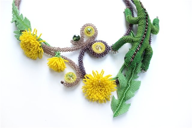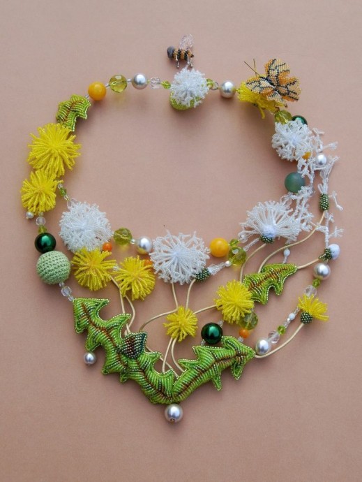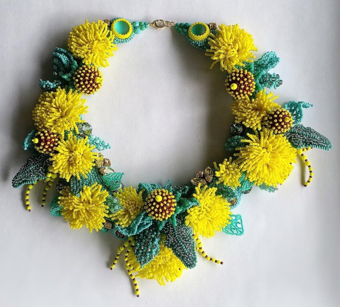 Красиво, огромная кропотливая работа, но почти все колье тянут больше на венки, чем на украшения. Такой массивный венок вряд ли будет уместно надеть на платье или кофточку. Он напоминает огромные венки из цветов на папуасах Новой Гвинее. Очень жаль, что такой колоссальный талант и труд растрачивается на поделки венков.