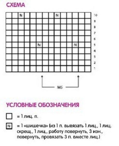 Узор «шишечки»: число петель кратно 6. Вязать круговыми р. по схеме. Повторять раппорт и с 1-го по 10-й р.