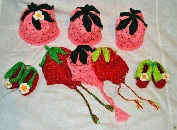 Через 3 см от наборного края вязать 28 р. узором "ежевика", затем снова лиц. гладью и для плодоножки связать 1 р. следующим образом: * 5 п. лиловой/фиолетовой нитью, 1 п. двойной зелёной нитью, повторять от *.