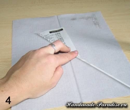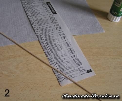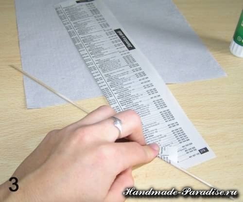 Крутить трубочки можно из журнальных страниц, упаковочной бумаги, кассовой ленты, из школьных тетрадок и, конечно, из газет — из самого доступного материала. Разворот газеты — одна страница разрезается на 4 части. Крутить трубочки будем на шашлычную палочку, можно также использовать тонкую спицу (мастерицы со стажем прекрасно крутят трубочки даже на коротенькую спичку).
