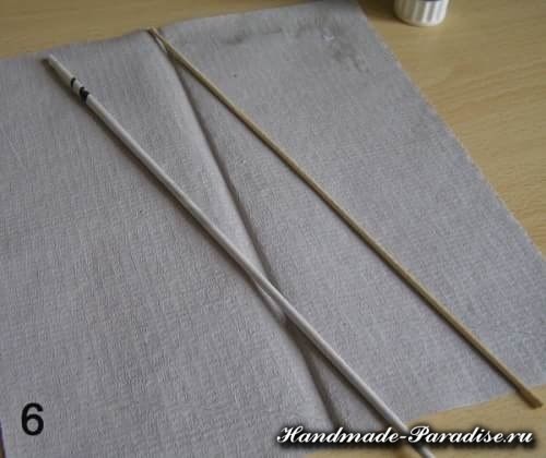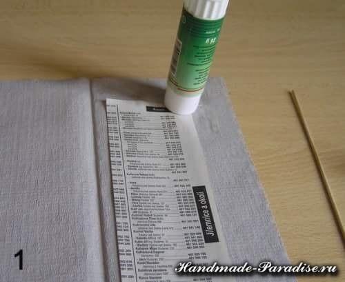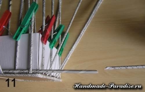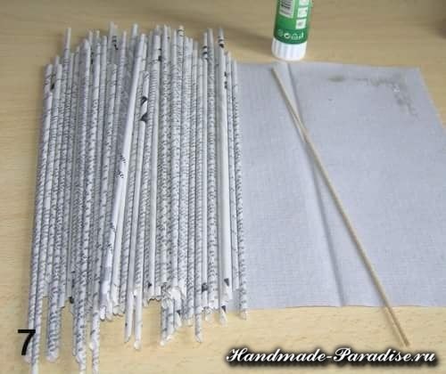 Разрезаем газету, берем одну полоску и кончик смазываем клеем. Обратите внимание под каким градусом нужно положить палочку для кручения — приблизительно 30 градусов. При таком положении палочки трубочки у вас будут скручиваться правильно. При правильном кручении трубочек один конец должен получиться шире другого, это необходимо для наращивания, склеивания трубочек между собой в процессе плетения. Накручиваем газетную полоску на трубочку: