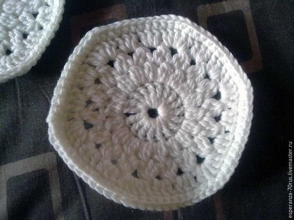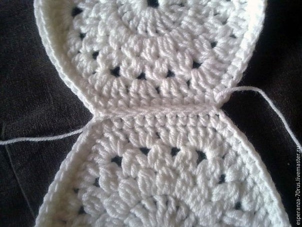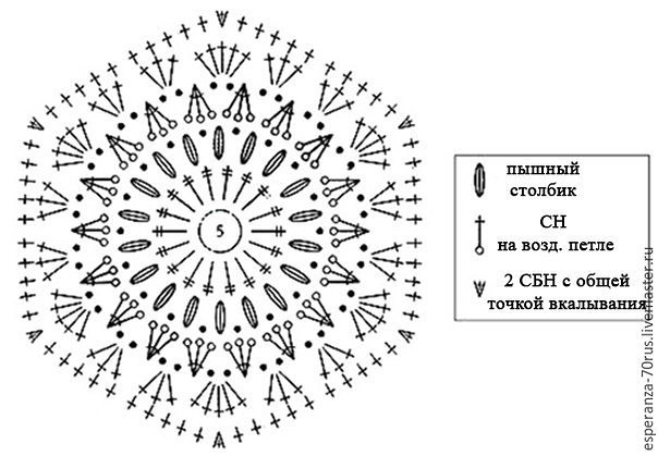 Набрать 17 возд. пет +3 пет. подъема, в 4-ю пет пышный столбик,пропустить 1 пет и ещё пышный столбик-так 9 пышных столбиков. 3 пет подъема,вяжем пышные столбики между столбиками ...