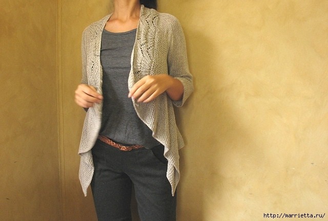 5-й ряд:1 изнаночная, 4 лицевых, 1 накид, (1 лицевая, 2 изнаночных)*8раз, 1 лицевая, 1 накид, 4 лицевых, 1 изнаночная.