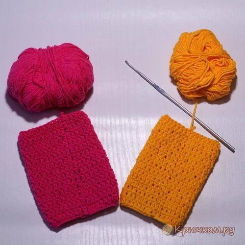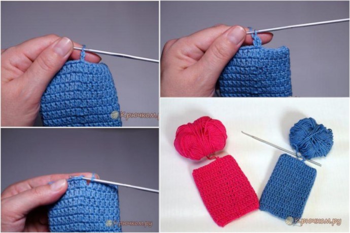 Начинаем ряд с набора двух воздушных петель. В эту же петлю провязываем ССН. Продолжаем вязать столбиками в каждую последующую петлю основания. Заканчиваем каждый ряд соединительным столбиков в петлю основания первого столбика, а не в ВП подъема. Как видите шов менее заметен. Вот вам снова для сравнения 2 образца. На синем использован третий способ решения проблемы смещенного шва. Надеемся у вас все получилось.
