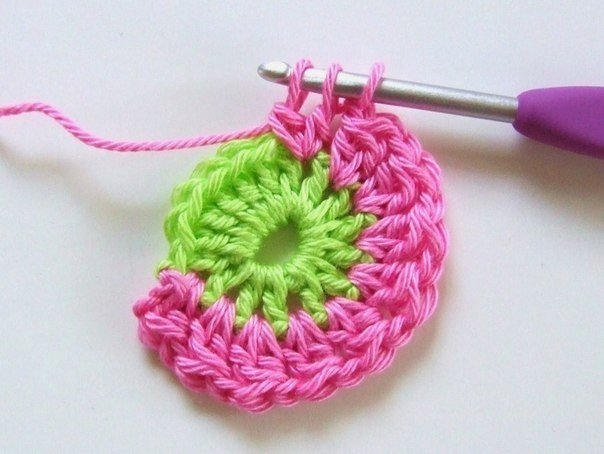 Набрать 17 возд. пет +3 пет. подъема, в 4-ю пет пышный столбик,пропустить 1 пет и ещё пышный столбик-так 9 пышных столбиков. 3 пет подъема,вяжем пышные столбики между столбиками ...