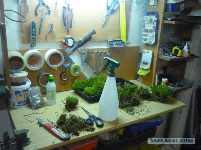 Основа состоит из 4-х слоев. В первых трех окошки вырезаются насквозь, а четвертый слой служит уже дном. Вставляем пучки. После опрыскивания водой мох становиться зеленее 100 долларовой банкноты.