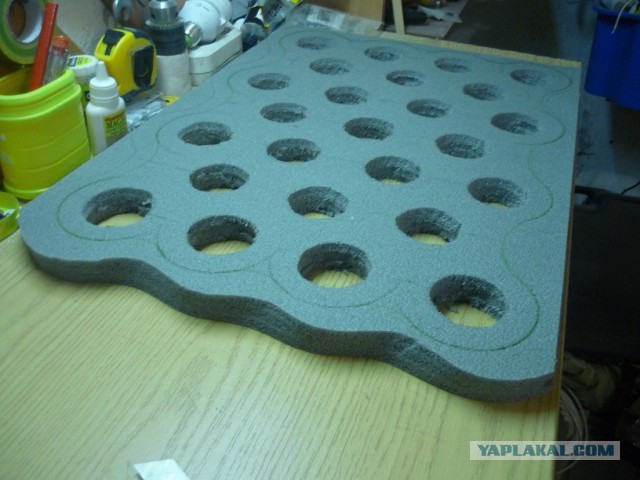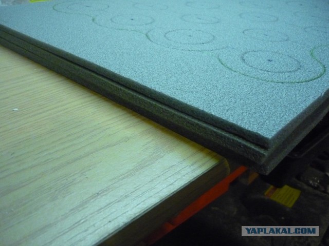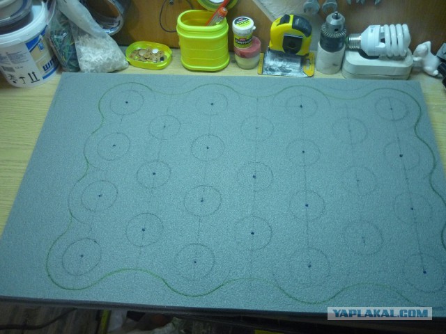 Был куплен вспененный полиэтилен в виде туристического коврика. Клей отечественный и циркуль. Делаю на картоне эскиз – 500х600 мм.