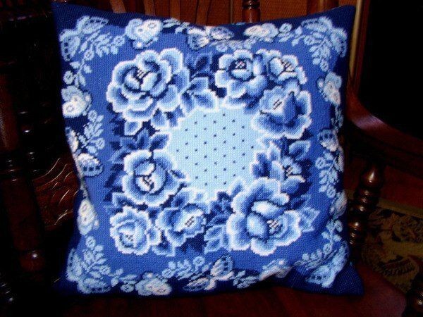 Схема вышивки подушки в технике Гжель это освежающая прохлада синих узоров в жаркое лето.