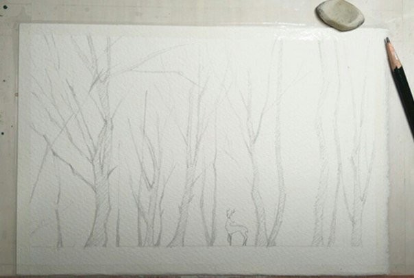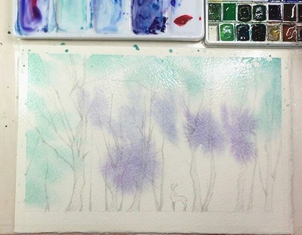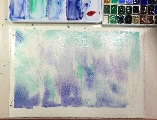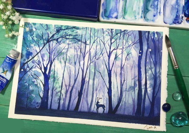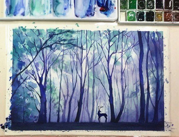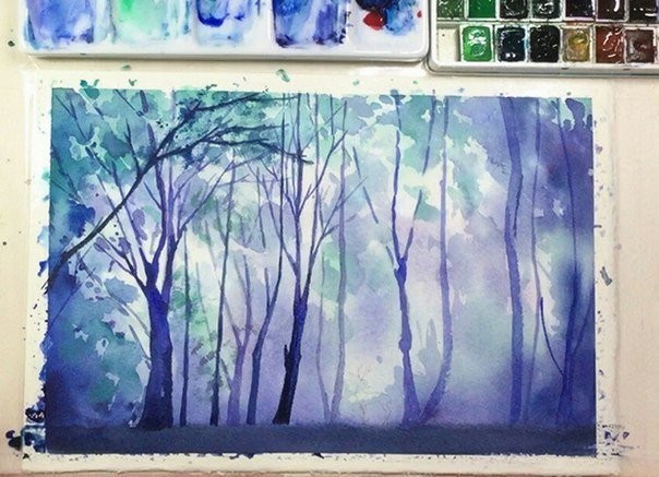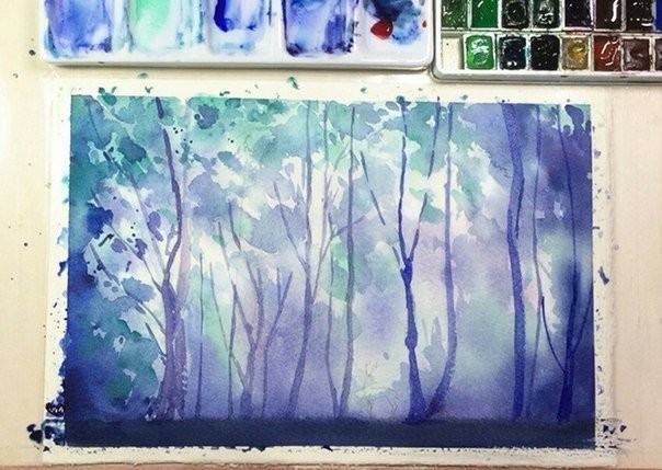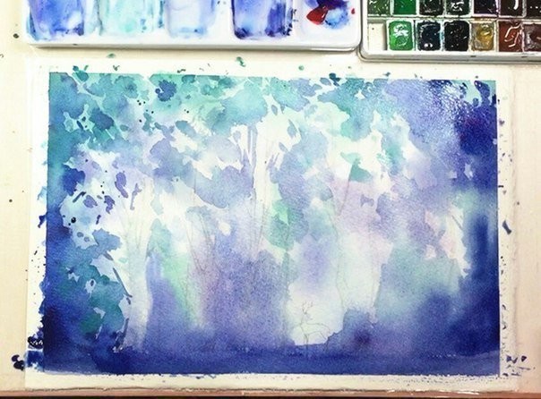 Чарующий пейзаж акварелью в синих тонах, потому что в летнюю жару даже рисовать хочется только холодными синими красками.