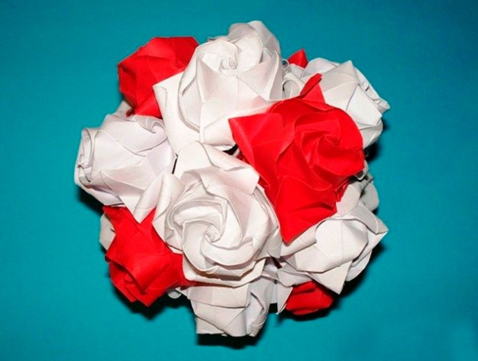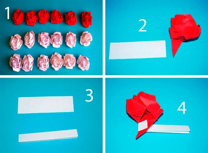 Сложите розочки из бумаги по данной схеме либо сделайте их другим способом, например, скрутив спиралью.