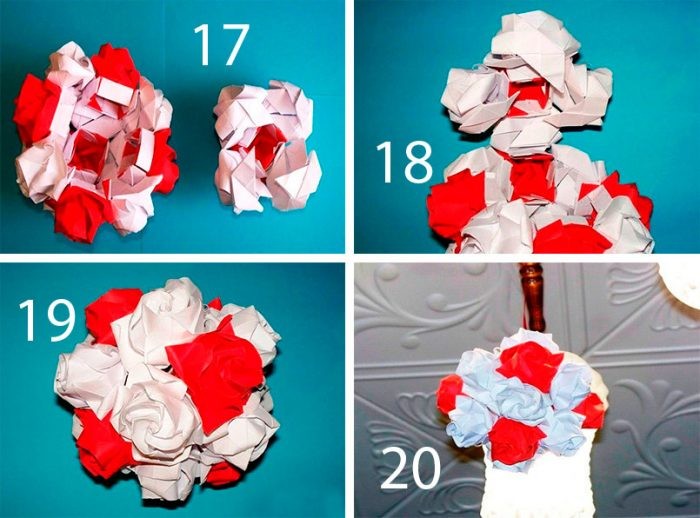 Приклейте 4 белых розы между красными и отложите заготовку в сторону.