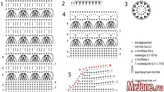 Набрать цепочку из 41 воздушной петли, связать на ней 4 ряда столбиками без накида (донышко), продолжить вязание узором по схеме 4, чередуя ряды из длинных петель и дуг до высоты 12 см. От наборной цепочки из в.п. тем же узором довязать вторую сторону детали. Обвязать деталь по контуру 2 рядами ст б/н. Соединить вертикальные края крючком (или иголкой с ниткой), на фото - обе стороны косметички. Сшить боковые стороны подкладки, пришить к подкладке молнию. Пришить молнию к крайнему ряду обвязки из ст б/н. Украсить замочек листком (схема 5).