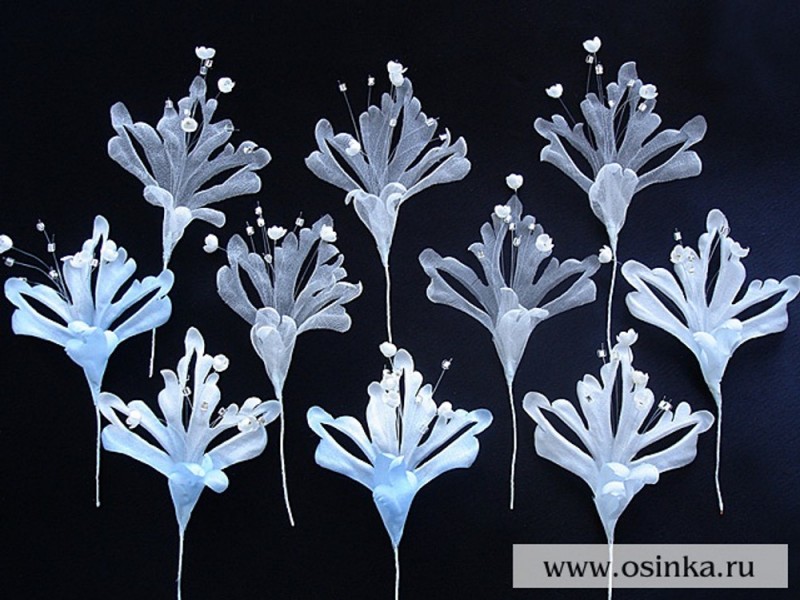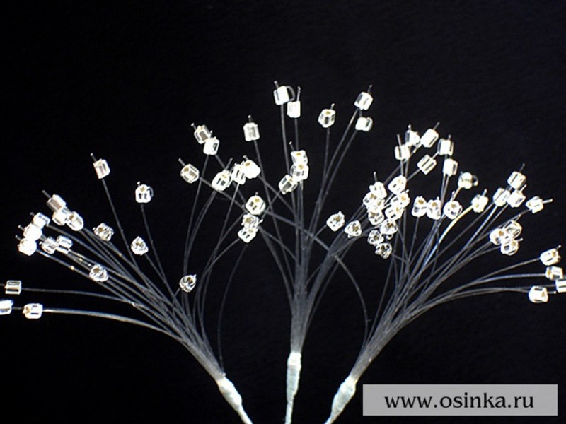Украшением для каждого лепестка является пучок серебристой рубки и мелких цветочков на леске. Количество произвольное, в данном случае по пять бисерных ниточек и по 3 цветочка. Высота – 5-7см.