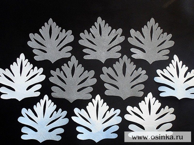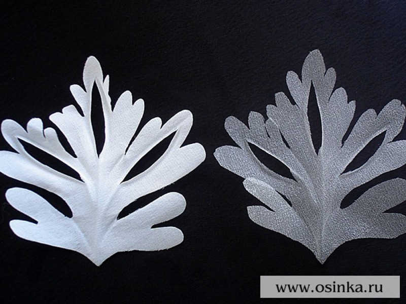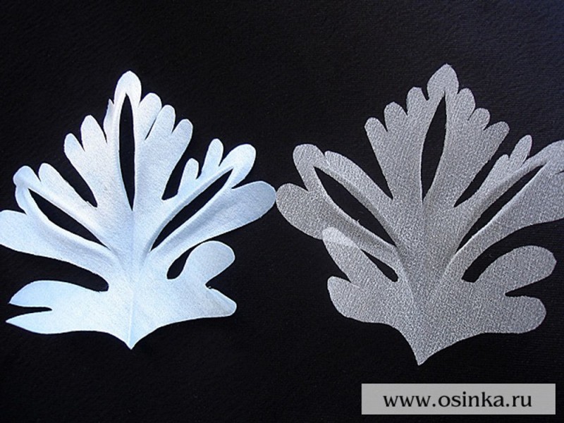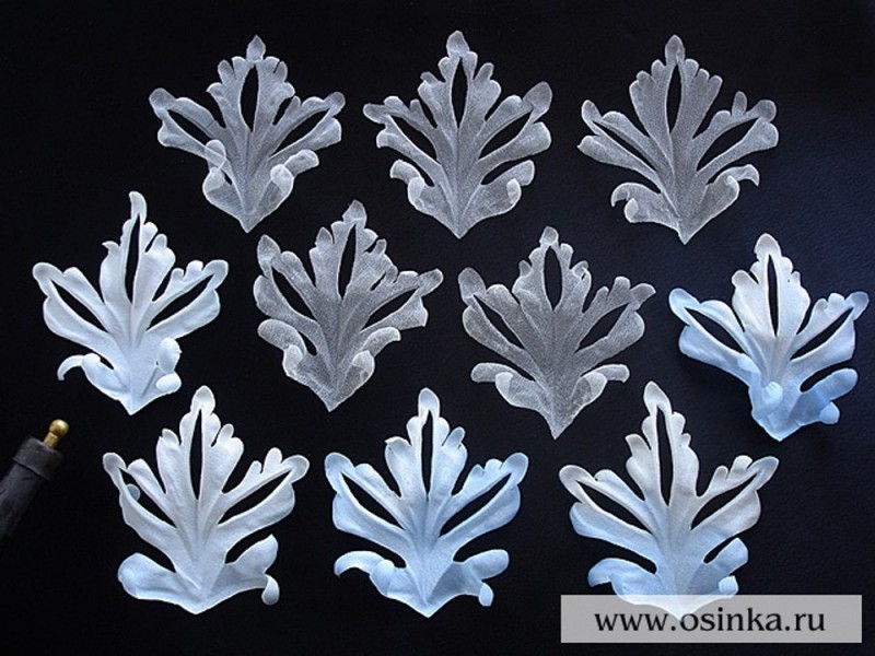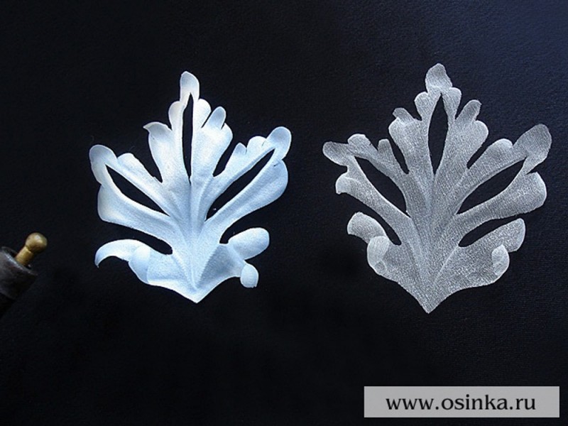 Выкройка цветка состоит из одной детали - лепестка сложной формы. Нужно из атласа и шифона вырезать по пять лепестков. Прежде чем делать вырезные «окошки» на лепестках, желательно их слегка тонировать голубым цветом, например, как в данном случае на атласных деталях.