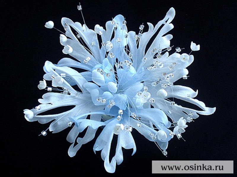 Шифоновые лепестки подклеить между атласными лепестками, слегка их выдвигая. Дополнительно можно вклеить легкие перышки боа. С изнанки сделать срезку лишней проволочки, закрыть чашелистиком и приклеить заколочку.