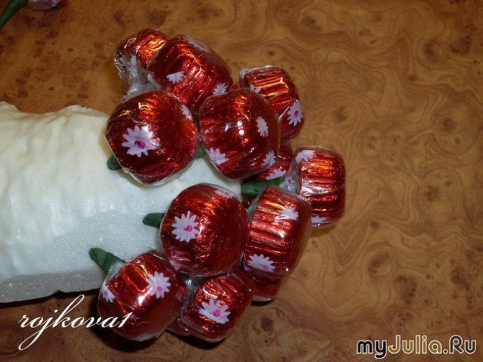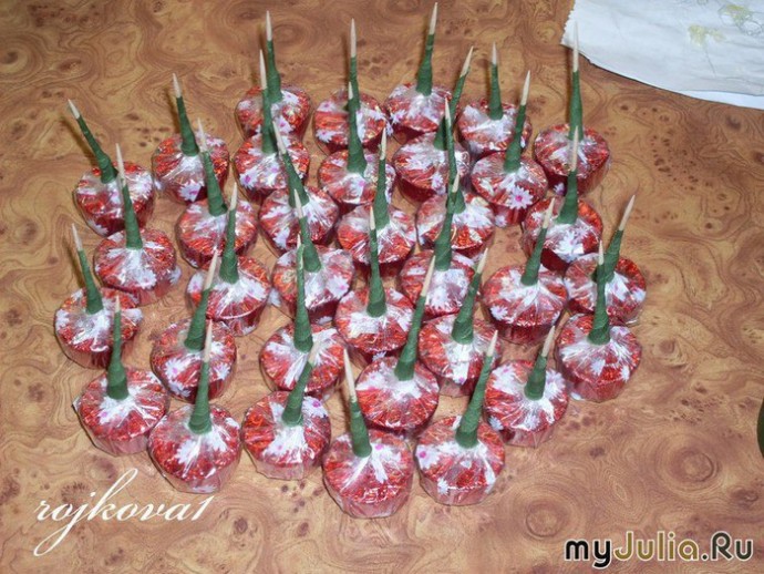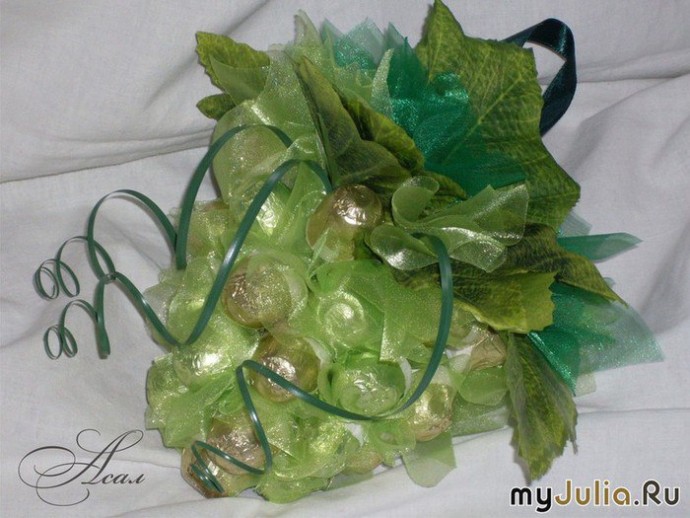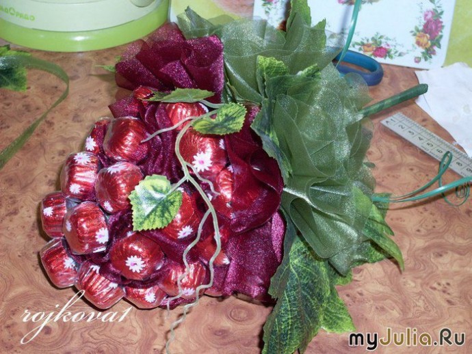 Виноград из конфет и органзы выглядит также аппетитно, как настоящий.