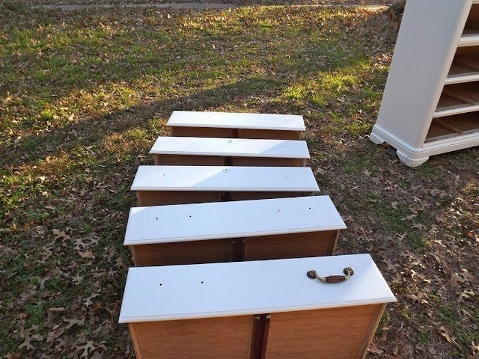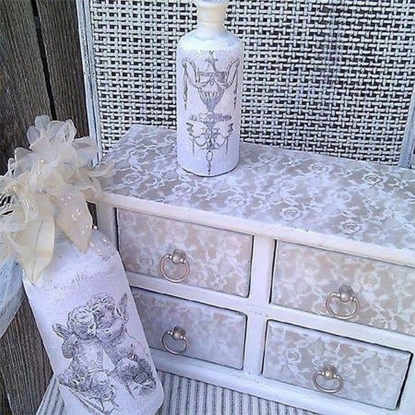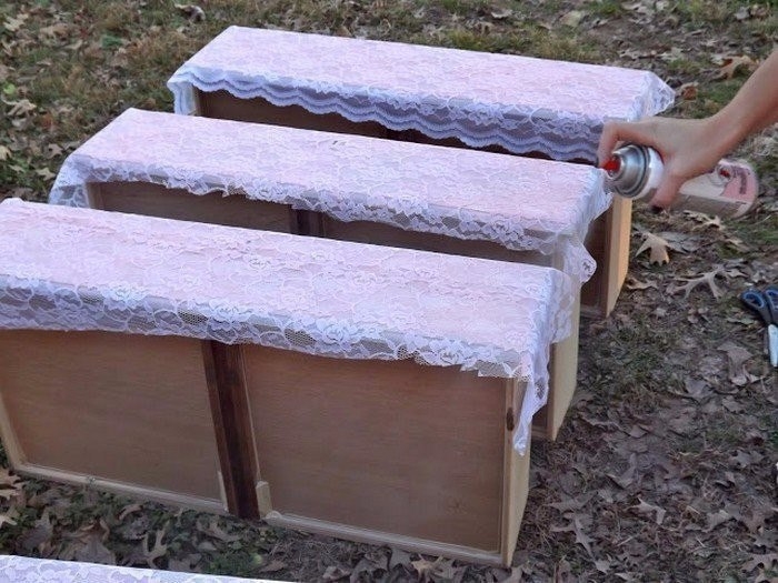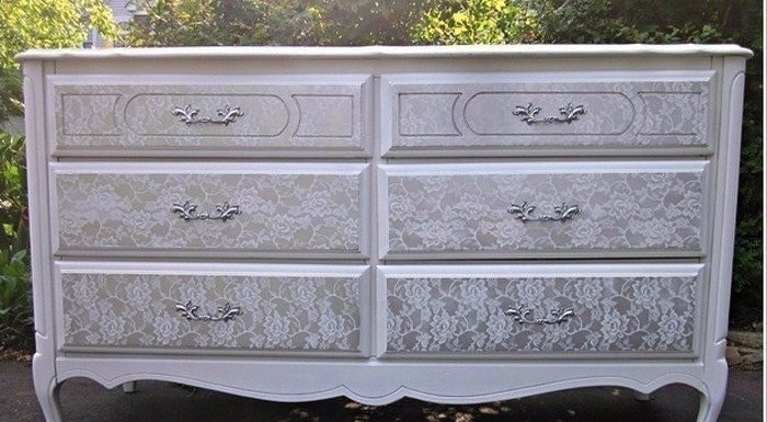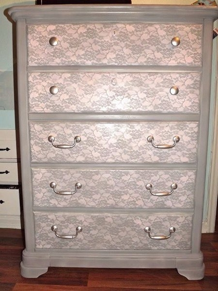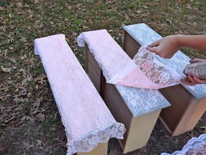 Декор комода при помощи баллончика с краской и отрезка ткани