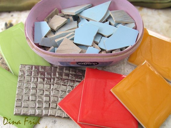 Девочки, я занимаюсь мозаикой. Куски битой посуды приклеиваются обычным клеем ПВА, ну можно взять ПВА для дерева или столярных работ. Главное, чтобы он держал эти куски на поверхности вазона.  Потом дают мозаике высохнуть и после покрывают затиркой. Это может быть даже просто цемент.