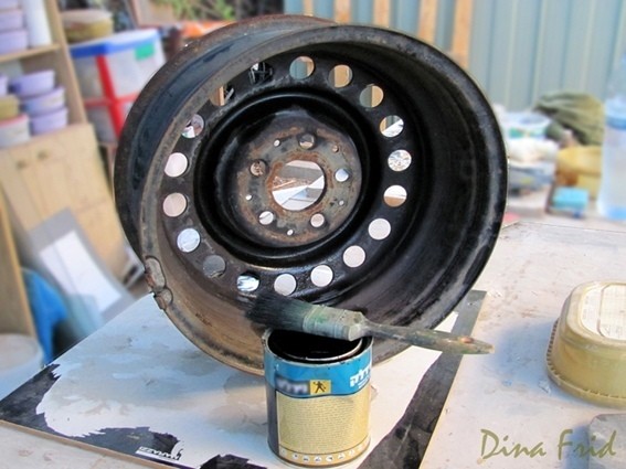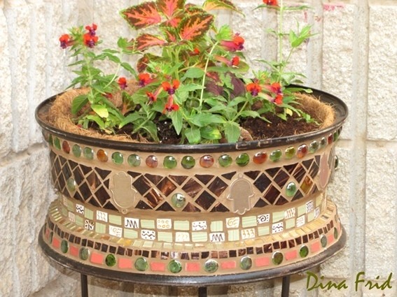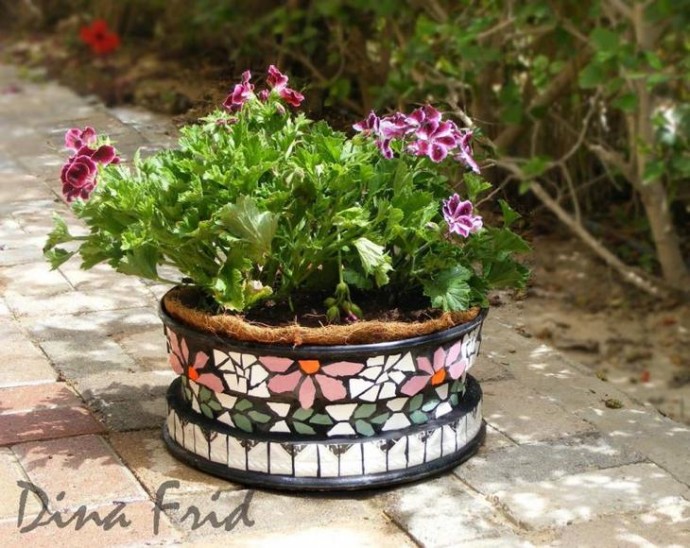 Вазоны для цветов из дисков выглядят умопомрачительно красиво.