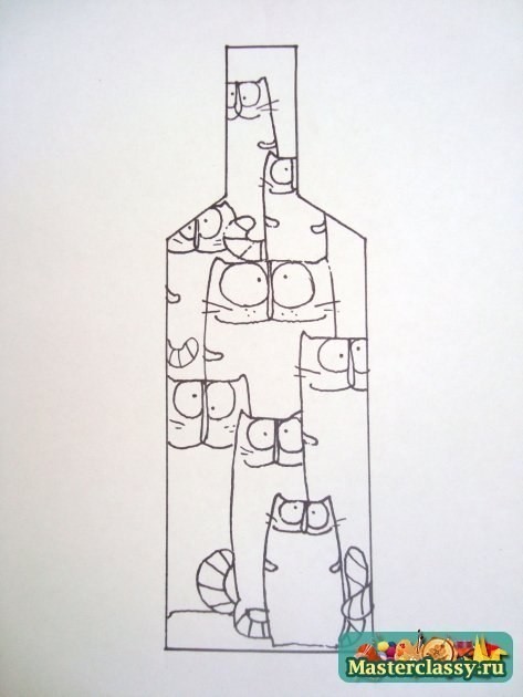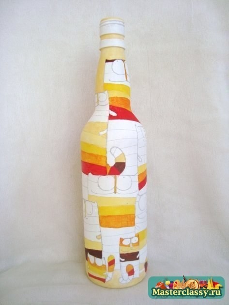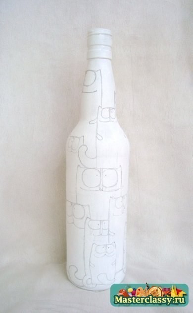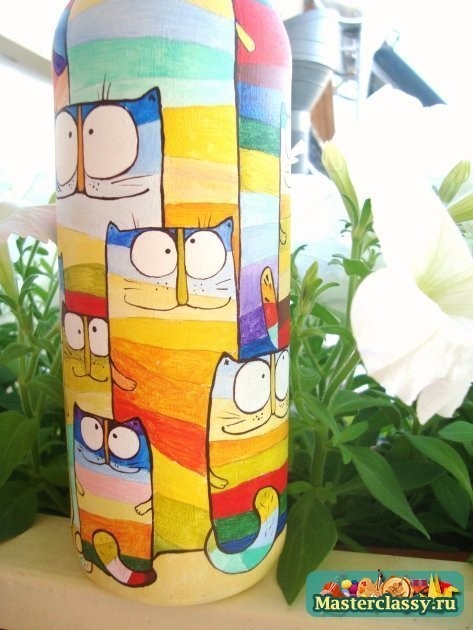 Роспись бутылки акриловыми красками "Коты" превратит ее в супер стильный элемент декора.