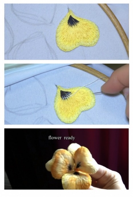 Сгибаем проволоку по контуру для анютиных глазок Пришиваем проволоку к канве Карандашом или специальным маркером размечаем направление стежков и цветовых переходов Начинаем вышивать, приближаясь к центру Последней вышиваем серединку Вырезаем цветок, концы проволоки перекручиваем, чтобы присоединить потом к следующим лепесткам